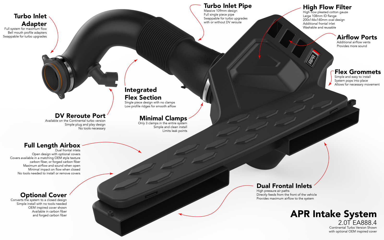 Это идеальная система впуска для двигателя 2.0T EA888.4. Это настоящая система впуска диаметром 109 мм, начиная с двух фронтальных впускных патрубков и заканчивая входным адаптером турбонагнетателя, который входит в комплект поставки и подключается непосредственно к турбонаддуву.Система полностью настраивается, что делает ее открытой или закрытой, как с оригинальными чехлами, так и с более стильными чехлами из углеродного волокна как из саржи, так и из кованого углеродного волокна.